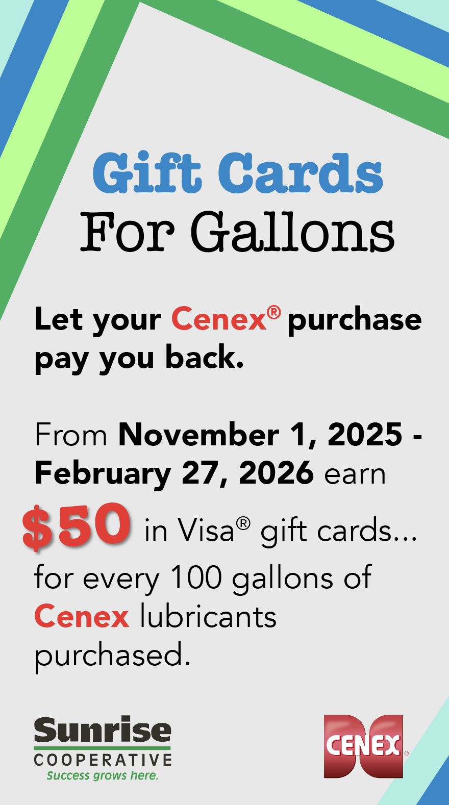 Now through February 27, 2026 for every 100 gallons of Cenex® Lubricants purchased, you receive a $50 VISA® gift card!